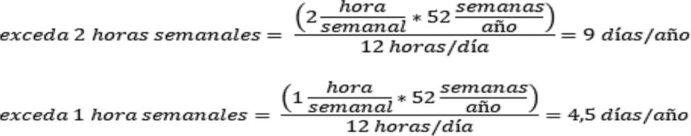 Exceda de 2 horas semanales= (2 horas semanales X 52 semanas del año) / 12 horas por día = 9